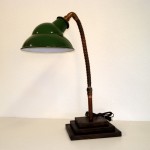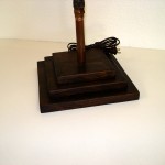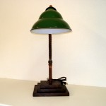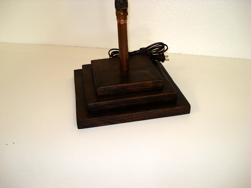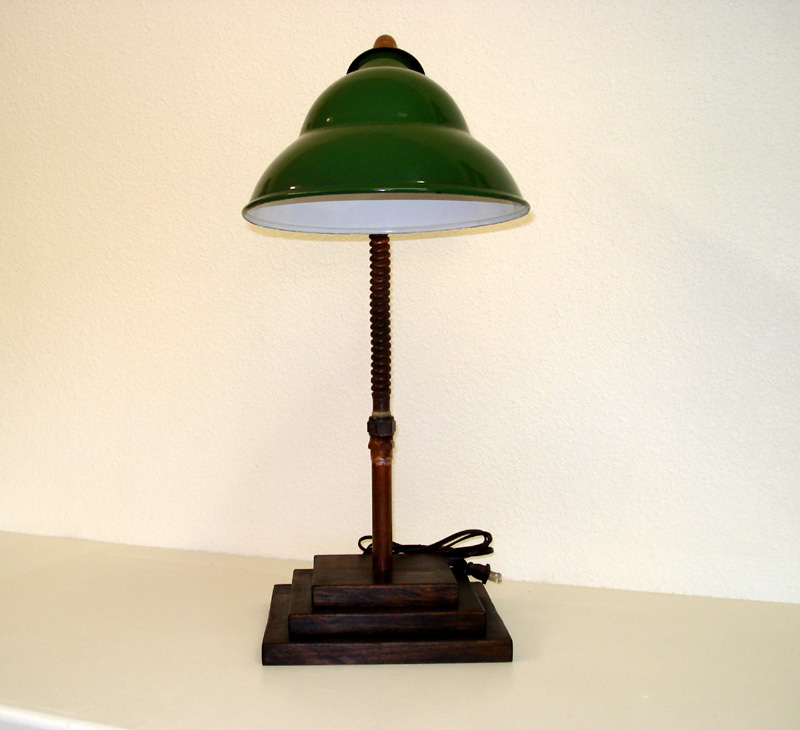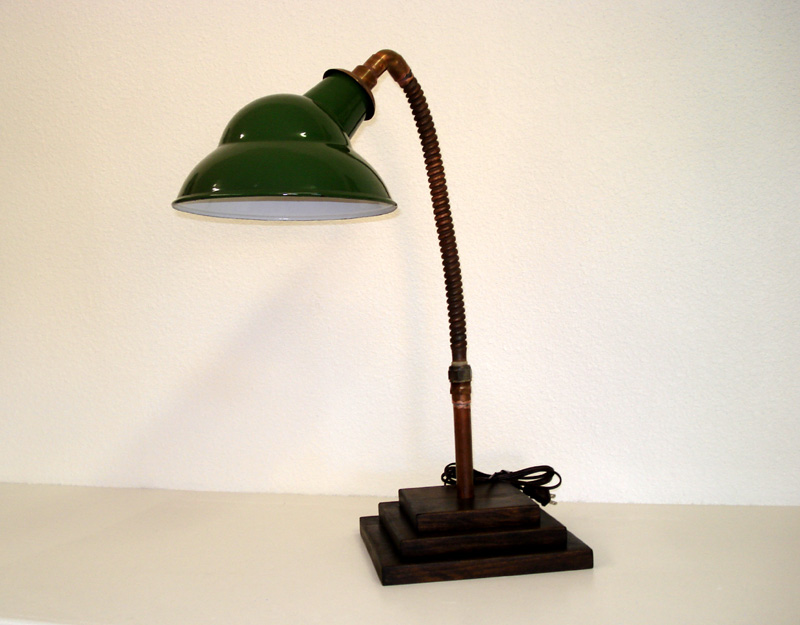 Mike has been collecting vintage industrial lamp shades and repurposing them to be lamps and chandeliers. This particular lamp was made with one of the old porcelain shades, some old copper plumbing fixtures, and a knotty alder base. It was made specially for a customer in Vermont.