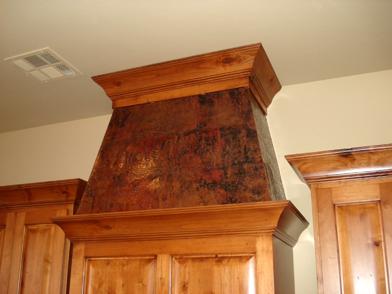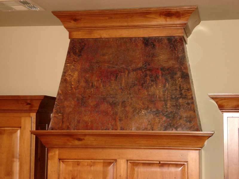 This simple copper covered range hood started out as a hood covered with faux copper laminateĀ and some wood trim. The home owners were led to believe the laminate would save money on the hood, and then discovered the look was just too . . . well. . . faux. They called Mike to see if he could fix the problem. He removed the trim, then attached beautiful leather textured panels in a simple plain pattern. The real copper panels just finished the desired look and the homeowners were very pleased, although wished they had not had the initial cost of the laminate to begin with.