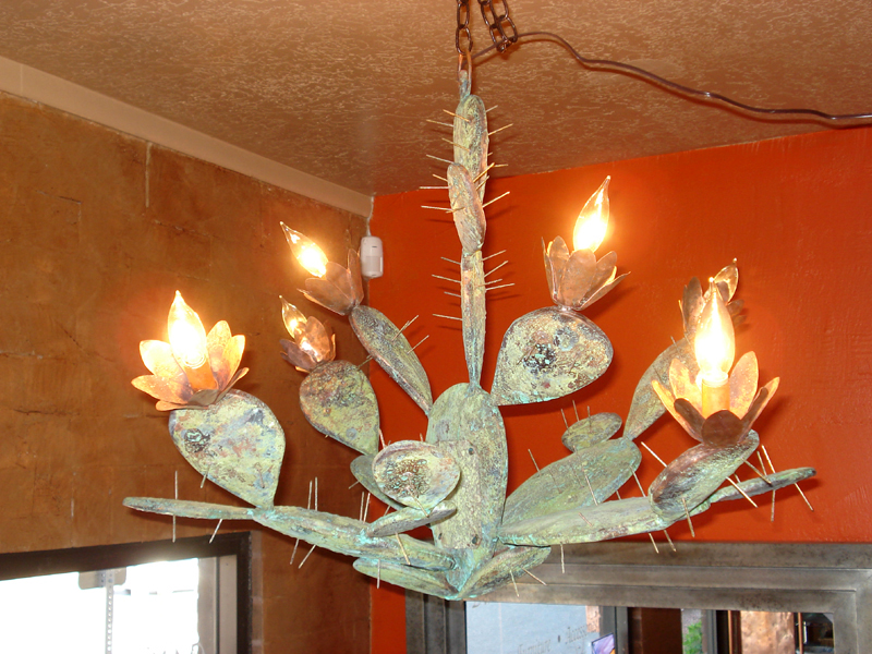 Mike made this copper cactus chandelier a couple of years ago as a custom order for a client. We were walking by the cactus gardens near the shop recently, and I was struck by how much they looked like this light. He has such a great eye for detail in recreating nature. This chandelier is about 20″ in diameter and 24″ high. It has 4 arms and 2 top leaves each with a light in the blossom end. The spines are all brass. It is completely hand formed from copper.