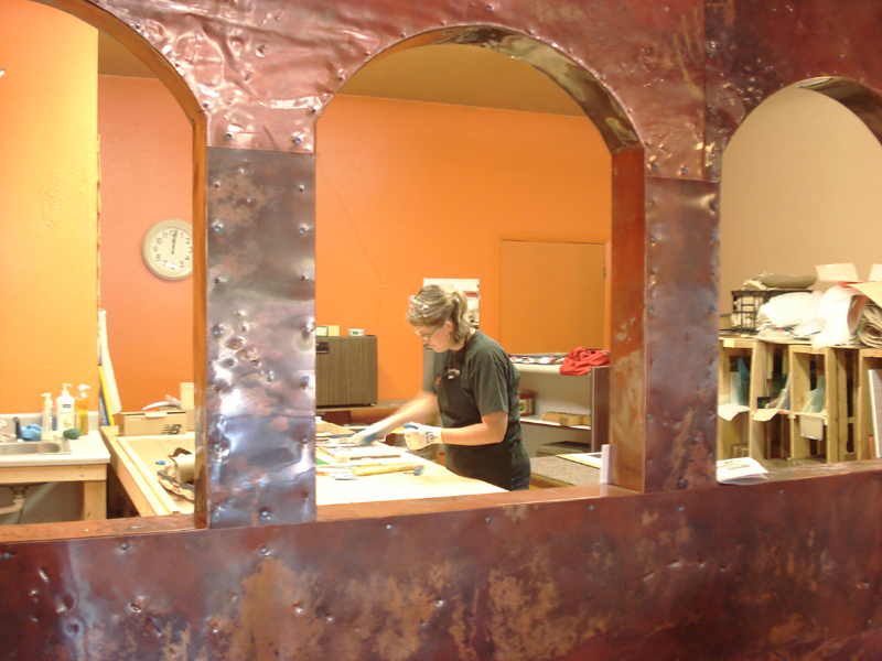 The South entrance to our local hospital greets patients and visitors with the warm glow of Mike’s handiwork in a whole wall of copper. The sheets of copper were carefully textured, patinaed, and fitted to the space, then the trim pieces were treated the same. The result is a beautiful accent to the entryway.