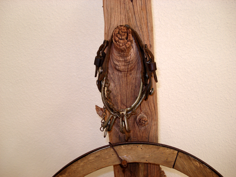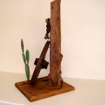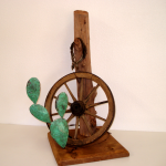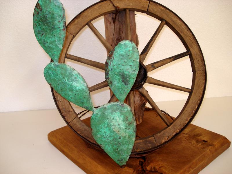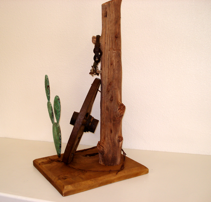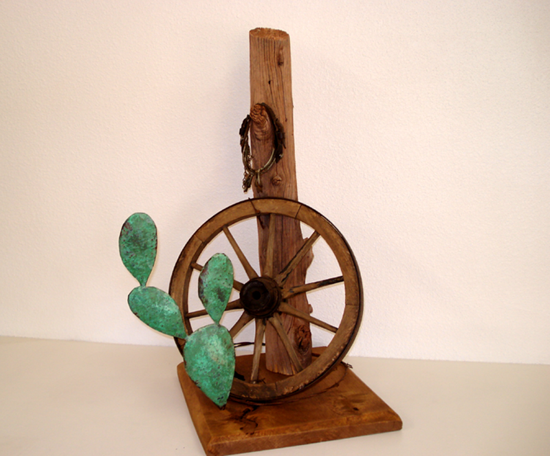 This sculpture hosts an old wagon wheel and a pair of vintage spurs, a scrap of fence post, and some barbed wire, all pulled together with one of Mike’s handmade, signature cactus figures. I swear we could have run onto this very scene on a hike in the desert near our home, and just carried it home.