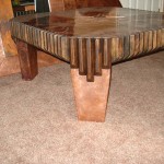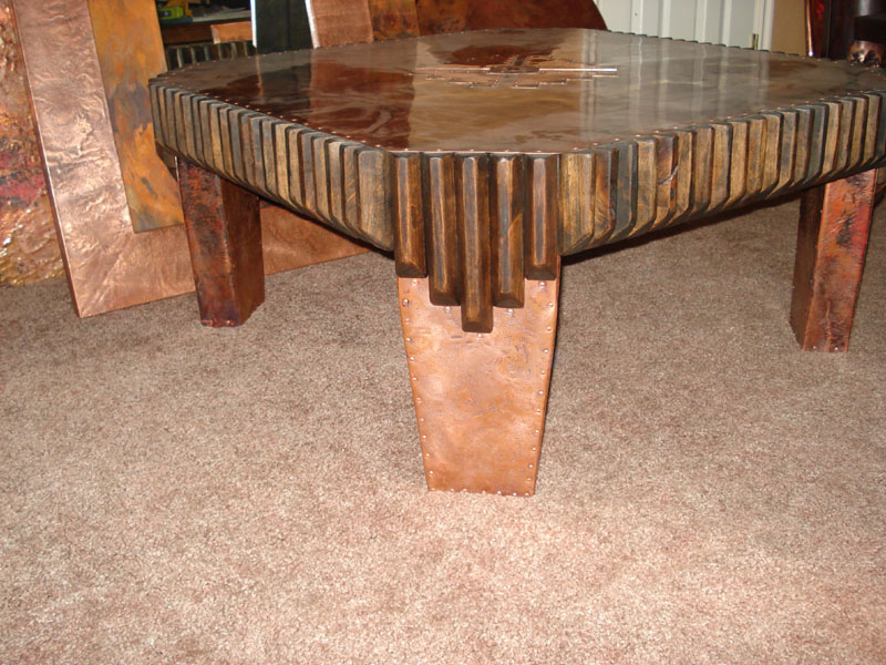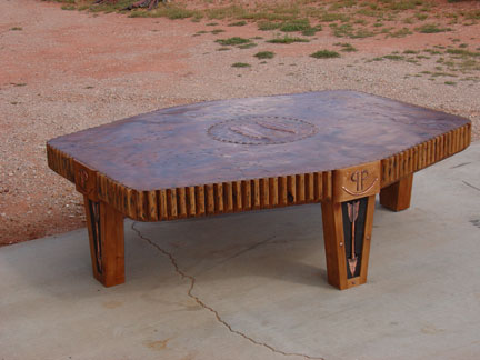 The table top was surrounded with wooden pieces, called applied pole, in the Molesworth style. The legs were inlaid with copper arrows that Mike hand-formed and hammered. This piece eventually ended up in Park City, UT.