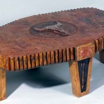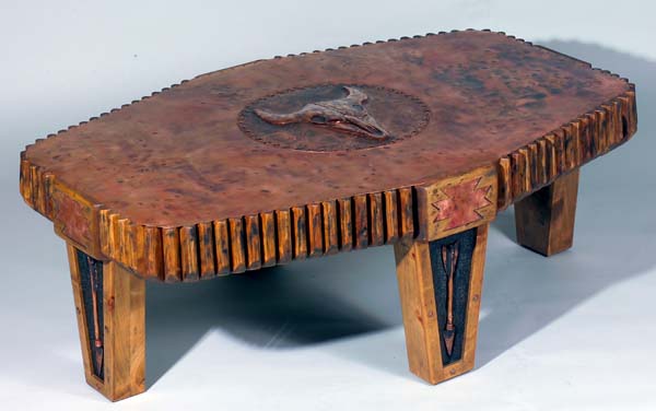 In 2004 Mike created this copper coffee table as an entrance into the Western Design Conference, then held in Cody Wyoming. The buffalo skull, formed over a wooden mold that he carved by hand, was surrounded with his leather texture. The medallion was permanently set on the antiqued copper top, and both pieces were nailed to the top of the alder wood table with copper nails.
