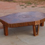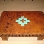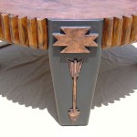 A second, similar table was created for a ranch in Montana with the Rancher’s requested 2Feathers emblem in the center instead of the buffalo skull. The Cody Table II resides in Ivins, UT., in a private collection of western art which includes some beautiful pottery by Maria Martinez. Mike has designed and created other applied pole tables which are featured in private residences.