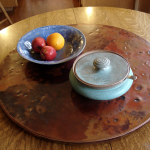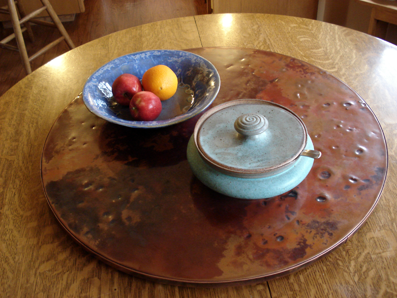 Mike just finished this copper and wood Lazy Susan. I don’t know why they’re called lazy when they are such work horses. Back in the day when our family of 7 gathered each night for meals, we would have benefited from one of these handy tools. We filled the center of the table every night with bowls and plates of food, and their small hands dived in to get the best morsels before their brother’s. The hardest part was “passing the salt, the pepper, the sauce” etc., before their own food got cold. Seven is a lot of people to please.