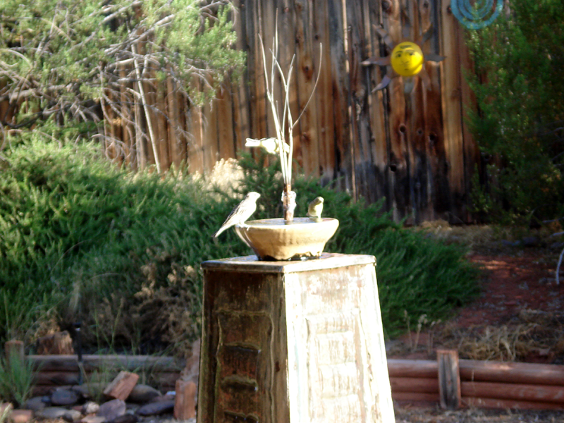 Over the years we have seen some very unusual birds in our fountain, but the locals are the gorgeous tiny yellow finches, the coral throat-ed house finches, and sparrows and chickadees. I love to sit in the kitchen with my coffee, and watch them through the window, early in the morning. They splash and hop around in the bowl, thoroughly enjoying their morning bath. Then they come back and perch on the copper branches and drink in the fresh bubbling water that is pumped out so gently from tiny openings in the copper.