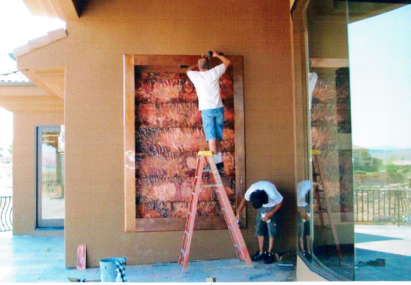 This copper water feature is backing the reception desk of the Fish Rock Grille, at the Ledges in St. George. Mike created the copper center and metal artist, Johnny Woolsey, made the steel frame that surrounds the copper. The water flows slowly down the folds of the copper, and the whole piece is lit softly. The water feature is about six feet high by five feet wide. The heavy textured copper resembles dark slate.