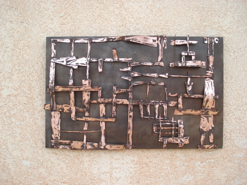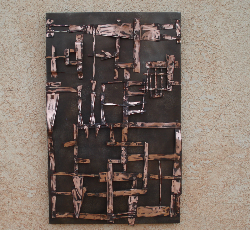Last night I asked our family to help me describe this new piece of copper art Mike created. I was looking for impressions. I got “Window Pain“, “City Scape”, and more than one “Abstract”.