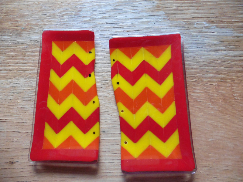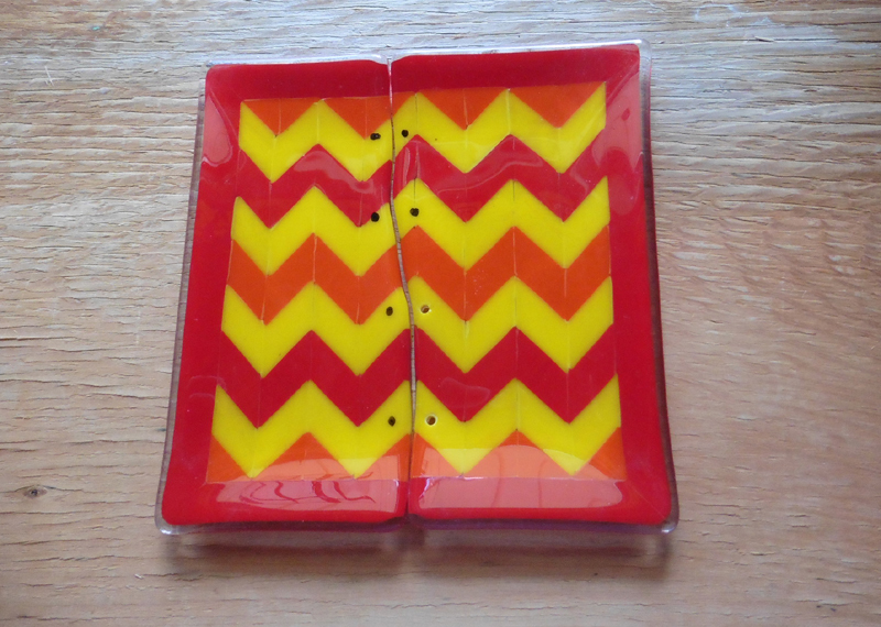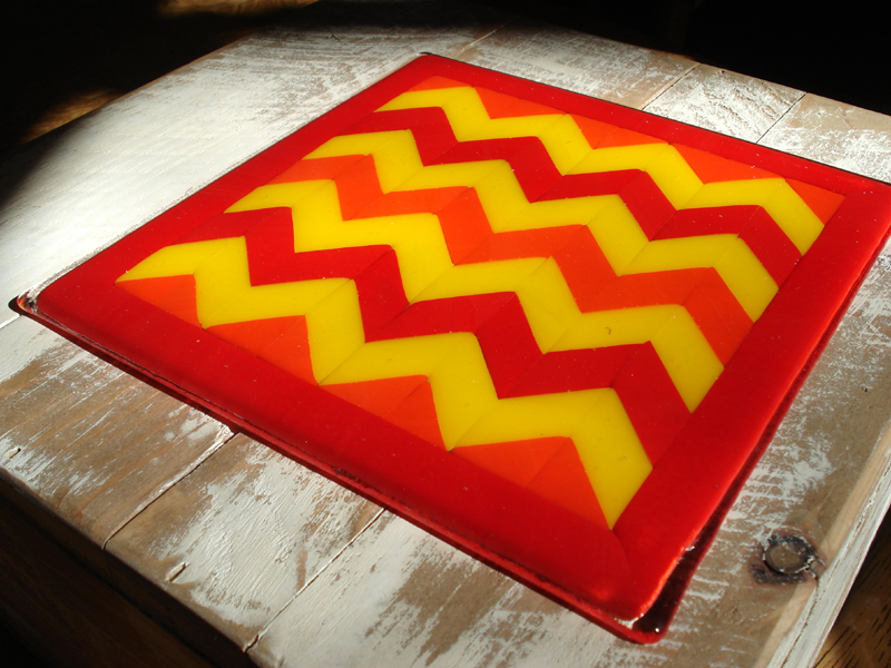 As I walked through the glass studio this morning, my eye was drawn to a bold color in the “fix it” pile. It was a chevron plate. I had spent hours cutting and piecing it together a couple of years ago.
