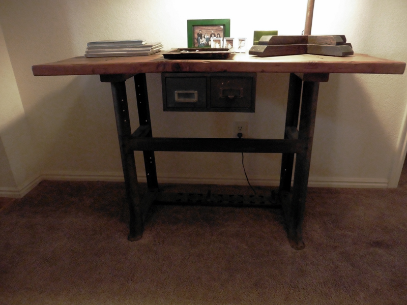Antique tables were made for functionality. Mike saw possibility in an old sewing machine table he acquired years ago. That industrial sturdiness is timeless. No plastic parts here, just character and stories.