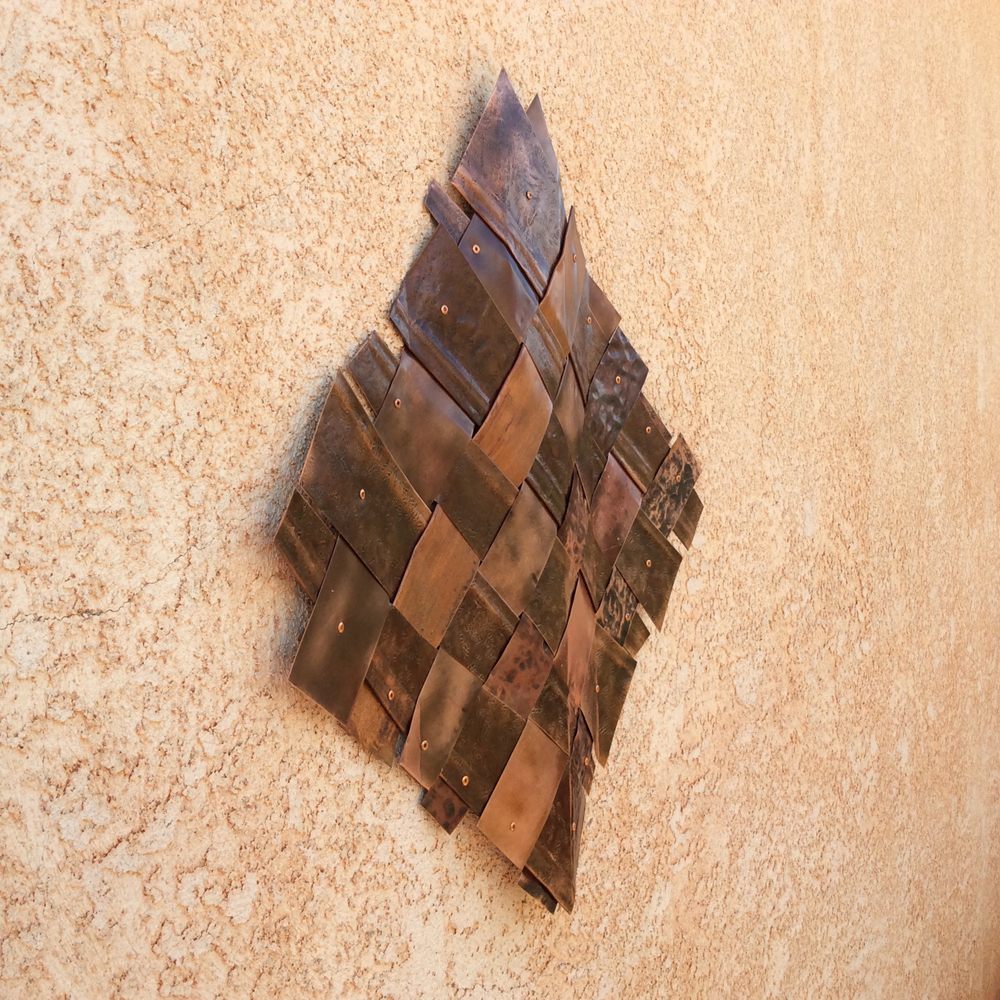 The square is a simple form of The Weave”. You can read more about that HERE. You can see the golds and reds of the copper that deepen with time. The deep umber of the hammered texture resembles shadows in the canyons. Mike gave each “weave” a gentle curve that creates motion. You will appreciate this movement when you hang this copper art on your wall.