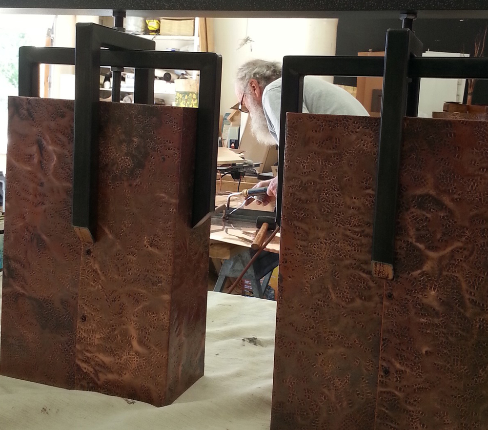Mike made the chandelier for a client’s outdoor kitchen. The light emanated from copper gives a warm glow. The crisp black of the steel contrasts the reds and golds of the warm copper. I can picture the celebrations to be held under this 4 piece beauty.